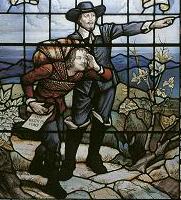 The graphic header I use as my blog’s theme is a stain-glass representation of a scene from John Bunyan’s classic Christian allegory The Pilgrim’s Progress. The picture is entitled ‘Evangelist Points the Way.’ This and several other stain-glass depictions of Bunyan’s book can be found at Bunyan Meeting Free Church in Bedford, England. Below I have included the text from the book describing Christian’s (the story’s protagonist) first encounter with the character named Evangelist. This excerpt is lifted from the Accurate Revised Text by Barry E. Horner.